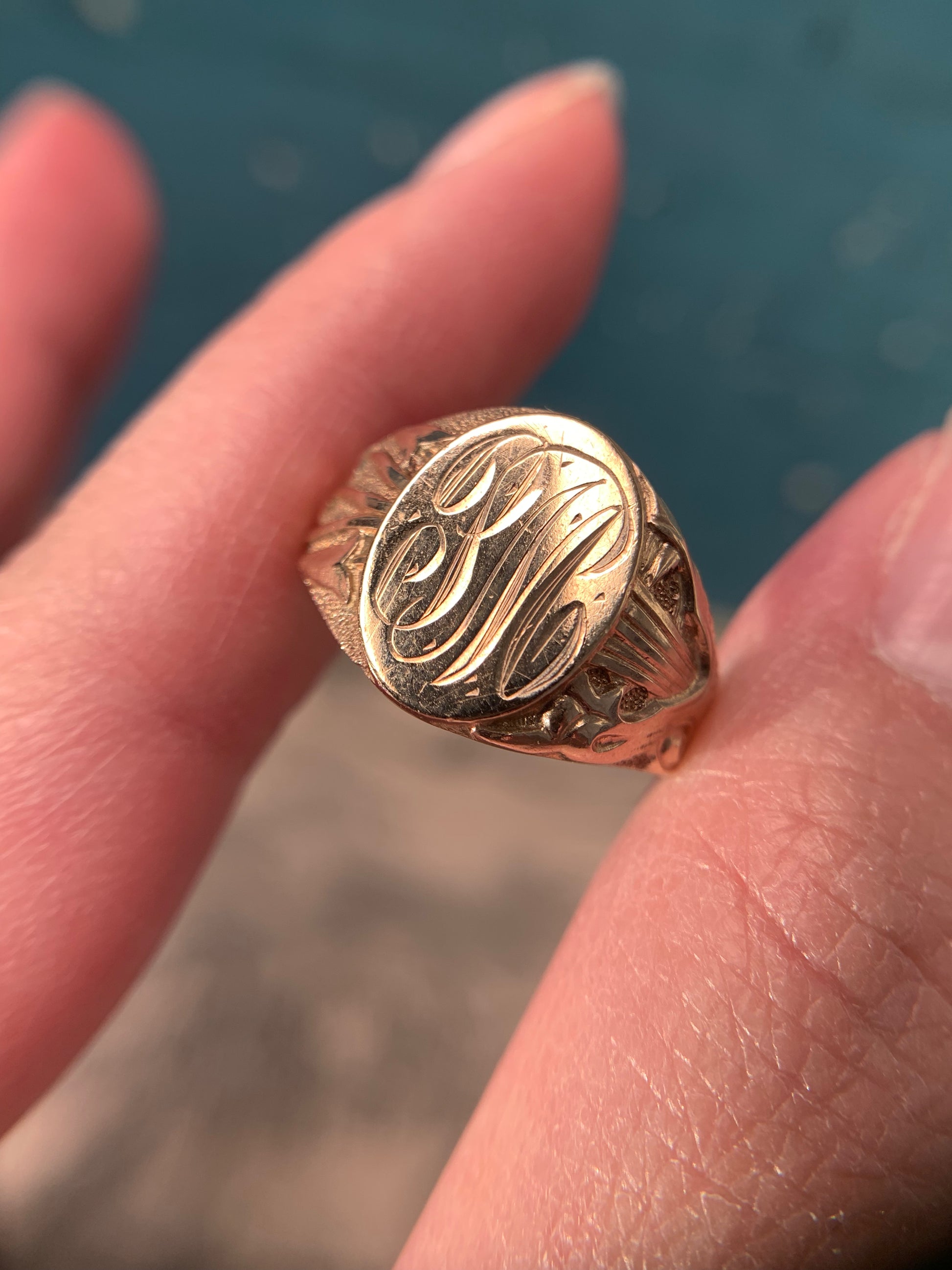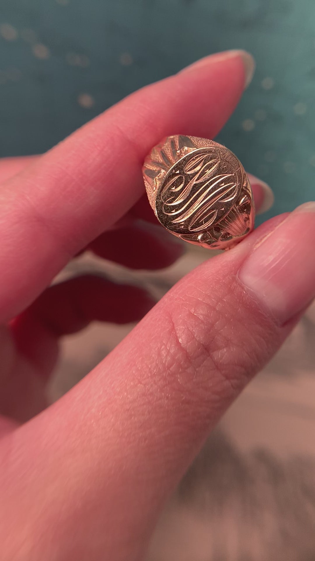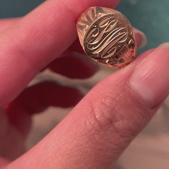 This rare antique Art Nouveau signet ring by JR Wood & Sons is crafted in 18k rose gold with extraordinary detail throughout. One shoulder features a sculpted dragon, the other graceful calla lilies—an enchanting balance of power and beauty. Its hand-engraved face adds a deeply personal, heirloom feel. At a substantial 6.23 grams, it has a satisfying, solid presence. A truly exceptional statement piece for collectors who appreciate artistry and symbolism.