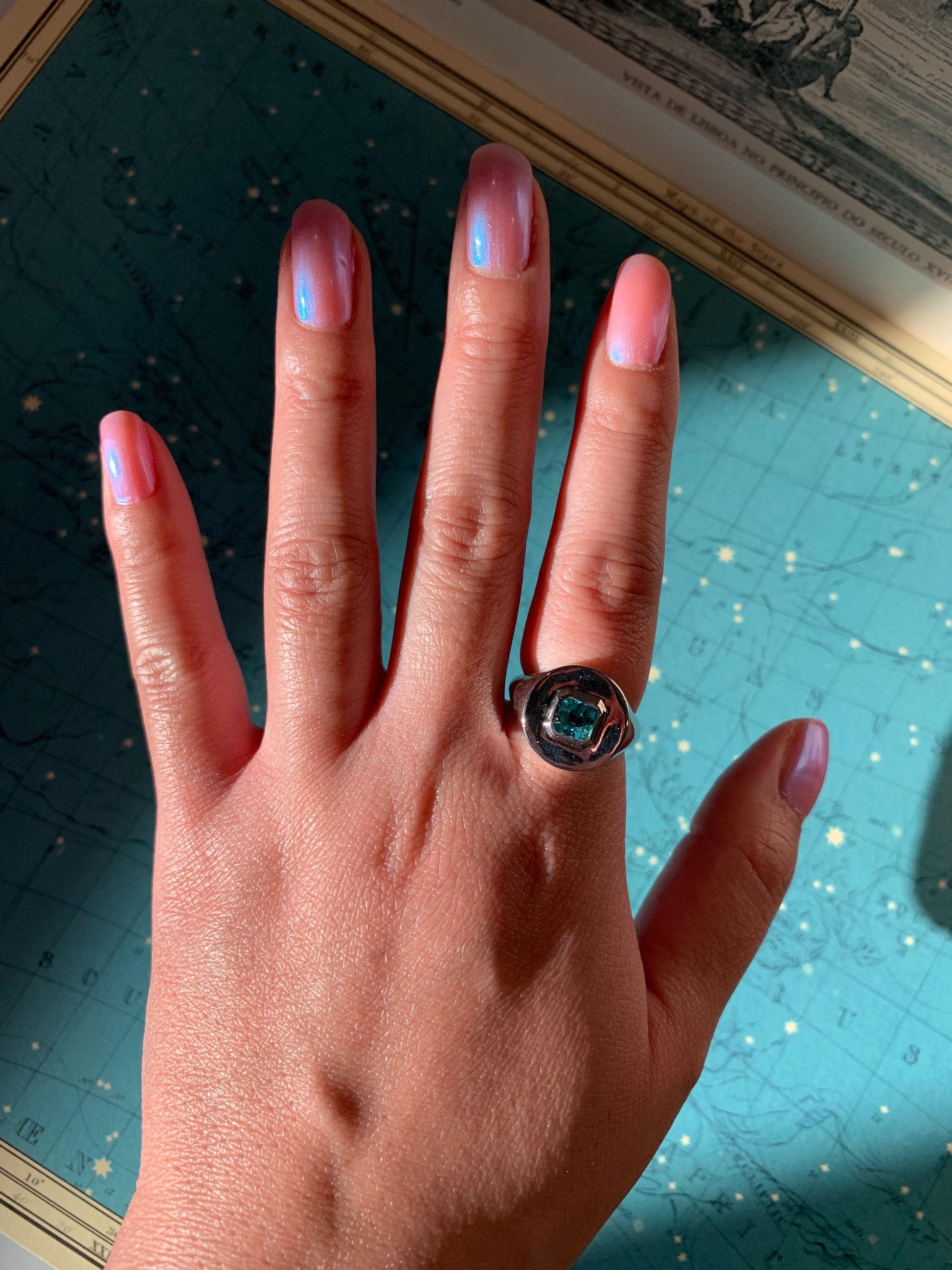 This striking 14k white gold signet ring by Fare Well Fine features a vivid 5×5 mm natural emerald, glowing with rich, saturated color. Its clean, modern lines balance beautifully with the gemstone’s organic character, creating a piece that feels both bold and timeless. It sits comfortably on the hand with a refined, sculptural presence. In excellent preloved condition, it has been gently worn and lovingly cared for. A perfect choice for the collector or style lover seeking a unique, emerald-forward statement piece.