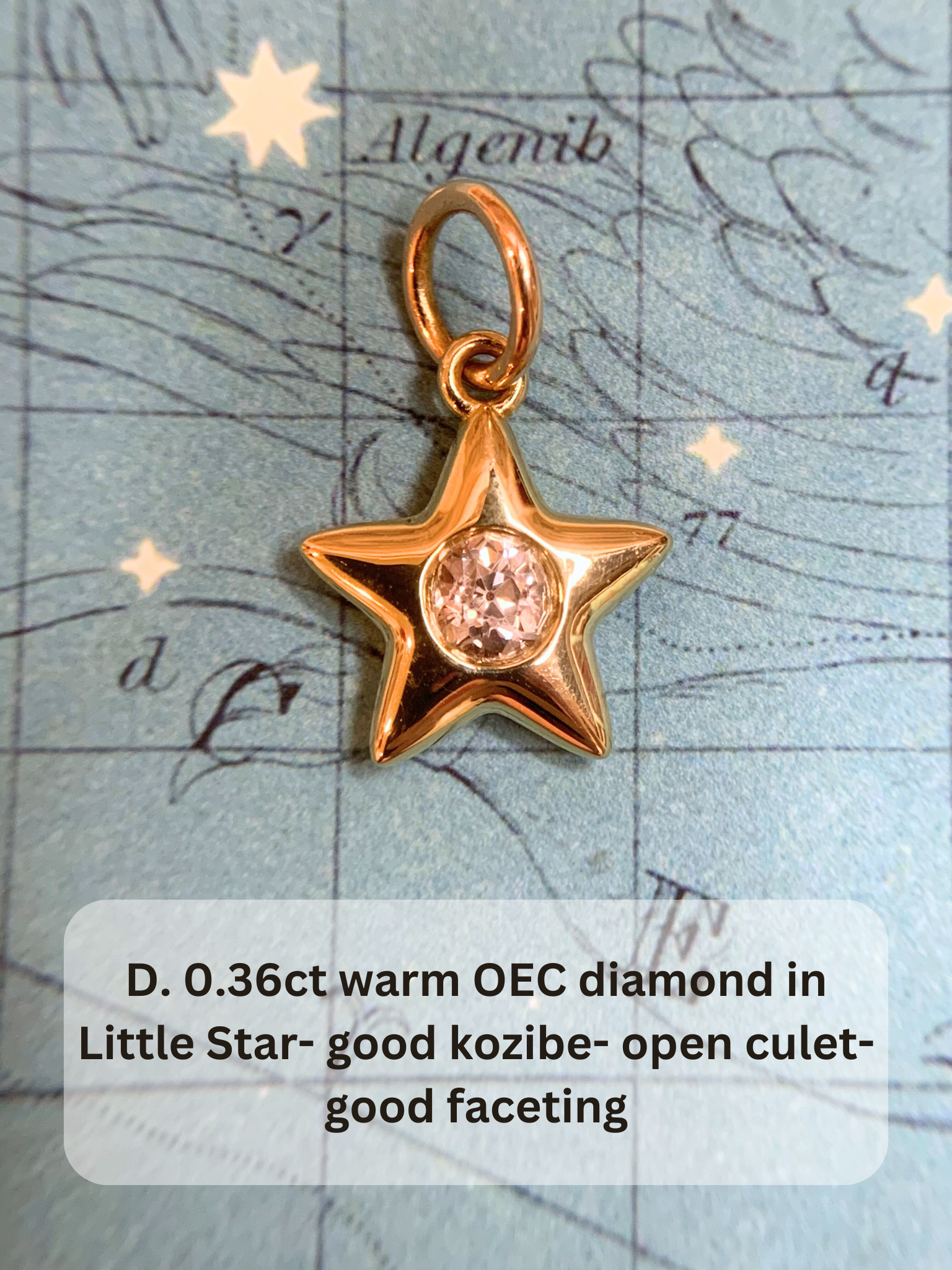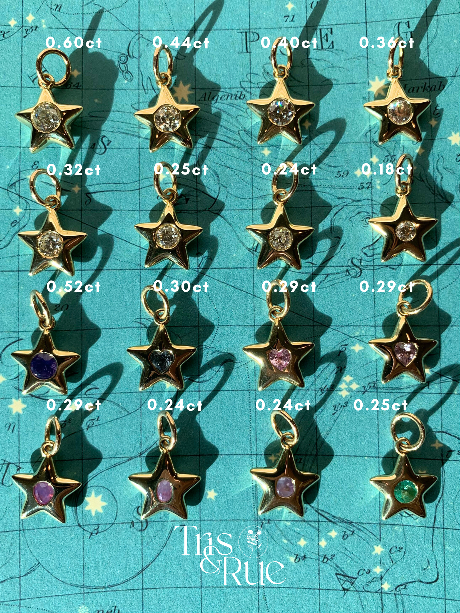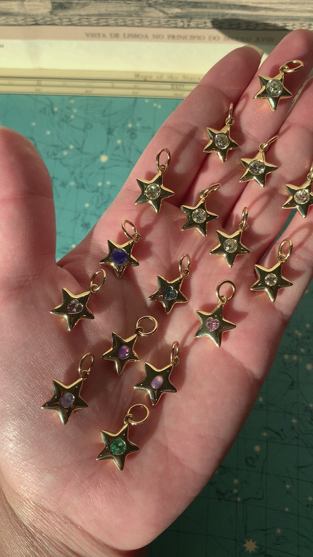 The Little Star© charms in volume 14 are each flush set with natural old cut diamonds, natural sapphires, and a natural emerald. The natural gems we use are untreated unless otherwise stated. They are usually more vibrant than they appear in photos. Inclusions have been considered in the pricing of each star. Please note that reclaimed gemstones may have minor surface wear, adding to the story of each Little Star©.